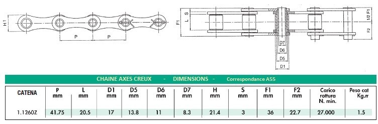 | Rouleau de 5 mètres de chaine axes creux - ISO 9001 - Pas de 41.75 mm Ø rouleaux 17 mm - Zinguée | |||||||