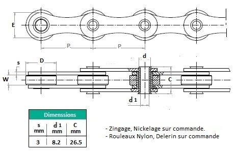 | Rouleau de 5 mètres de chaine axes creux - Pas de 50 mm - Ø rouleaux 31 - Entreplaque 10 (261) | ||||||||||||