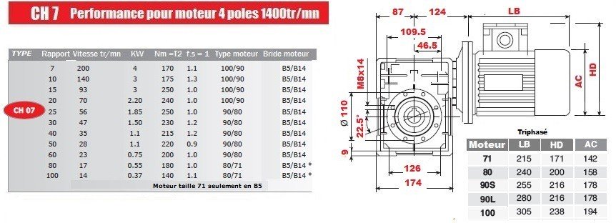 Motoréducteur Triphasé.Moteur 80A4B14/B3- ø 14-0,55 Kw-Réducteur CH-07R.-80-71F14-R1/80-17,5 tr/mn TRIB071A8014 454,10 € HT 544,92 € TTC