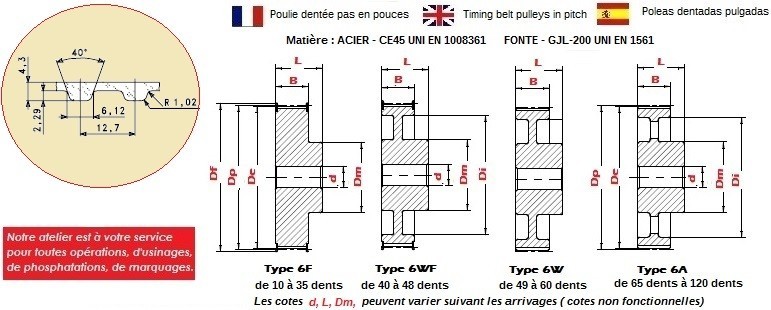 | Poulie dentée 17H075 - Acier - Pas 12,7 mm - Pour courroie 19,05 mm - Forme : 6F - 17 dents - DESTOCK | |||||||||||||||