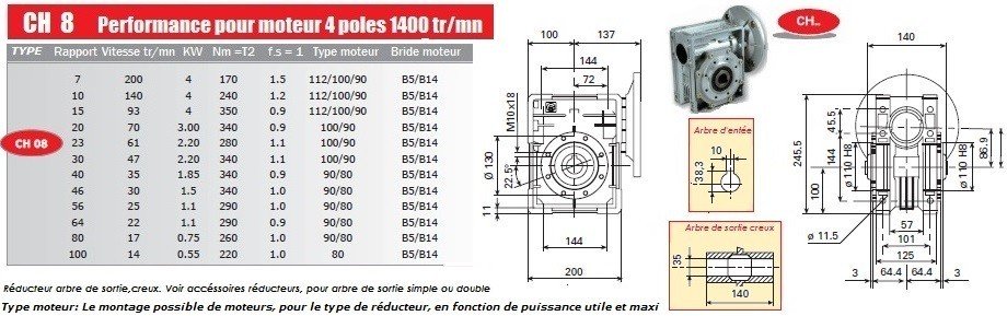 Réducteur roue et vis CH08 - Rapport 1/23 - Pour moteur taille 100 bride B14 - Arbre de sortie Ø35 mm
